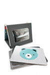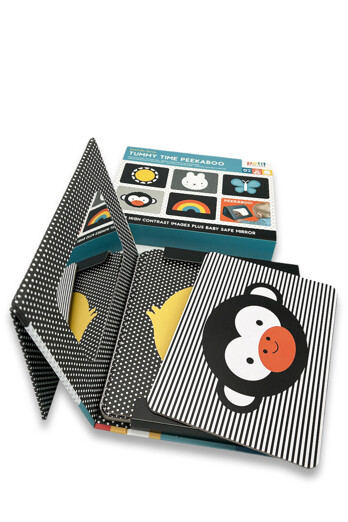 Om buiktijd in te stellen, klap je de eenvoudige doos open om de kaarten weer te geven, of draai hem om naar de kant met de spiegel voor meer plezier en verkenning. De inklapbare standaard bevat 6 dubbelzijdige kaarten met hoog contrast, opvallende vormen en een babyveilige spiegel.