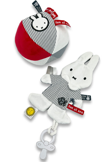 Nijntje Fun At Sea BalNijntje bal gemaakt van zachte materialen, in grijs met wit gestreepte uitvoering uit de Fun at Sea collectie. Beschikt over een rammeltje en verschillende afbeeldingen.